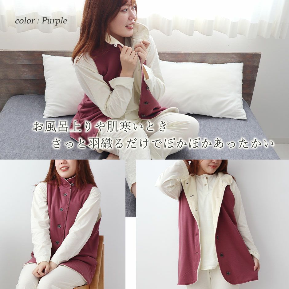 お風呂上りや少し肌寒いときにさっと羽織るだけ!お尻まですっぽり隠れる着丈で、テレビを見るときなどもしっかり防寒。新聞を取りに行くときやゴミ出しなど、ちょっとした外出にも便利です。