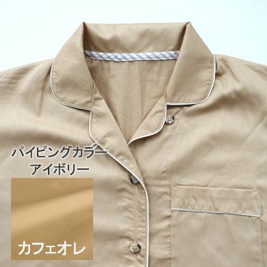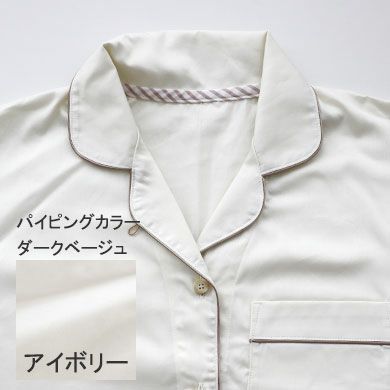 超長綿サテンをひきたてる、パイピング付オープンカラーの上品なデザイン。 【サンプル品につき40%オフ】スーピマ超長綿レディースパジャマ 上下セット・長袖/前開き/開襟パイピング 【アウトレット】