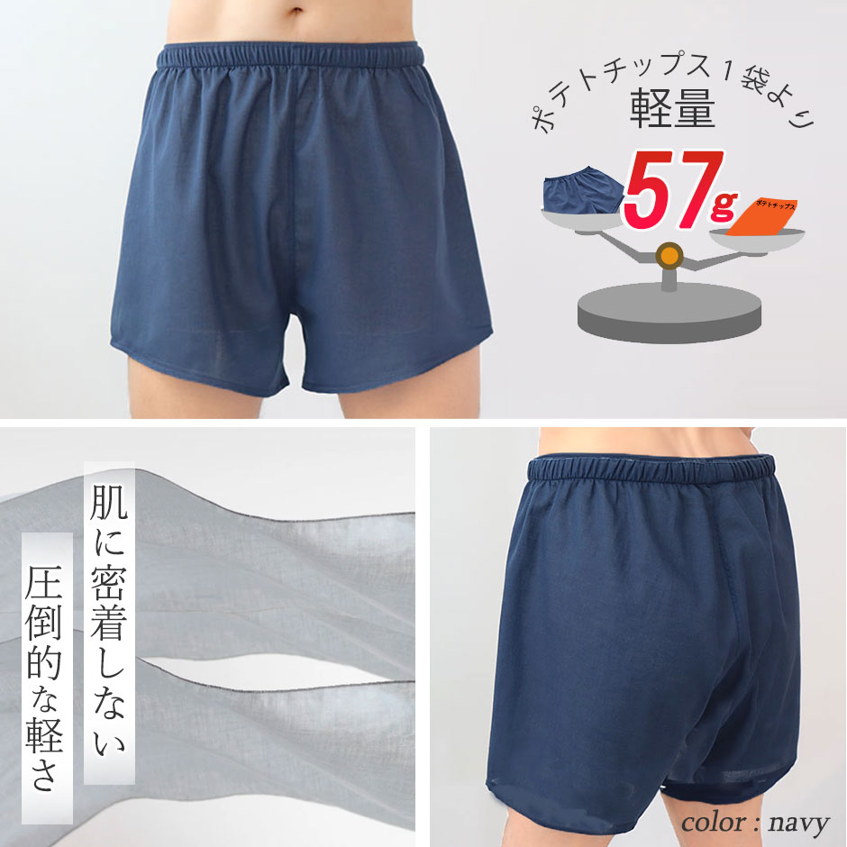 お客様からつくってほしいとのお声が多かったガーゼトランクス。なんとわずか47g!軽いので密着せず、肌にはりつかないので下着を付けていることをわすれてしまうほど!この解放感を味わうと、もう元には戻れません(スタッフ談)