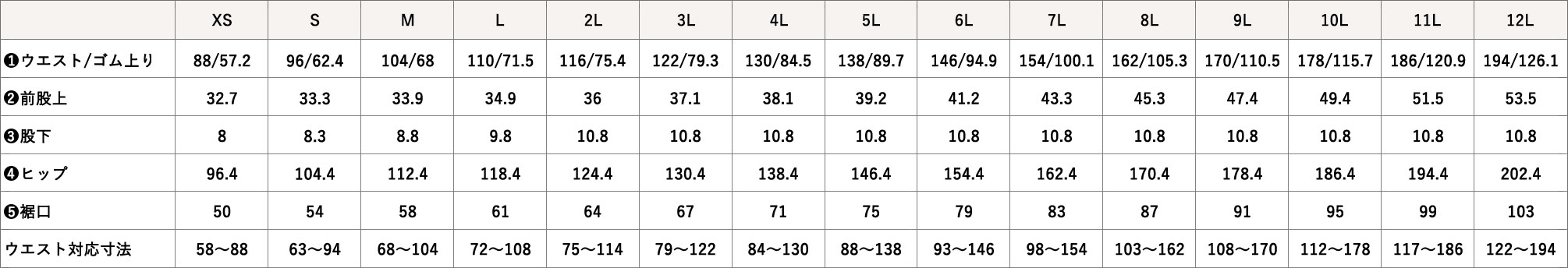 ズボンサイズ表のウェスト対応寸法やヒップのサイズから基本のサイズを選び、ウェストゴム上りをご覧下さい。