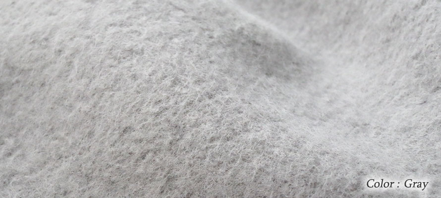 パイルニットの両面を起毛し、わた毛のようなふわふわした表情のある生地になりました。しなやかで肌にそっとよりそうようなフィット感と寝返りしやすい伸縮性を感じて頂けます。軽くて柔らかくあったかい、素肌にそのまま着ても 全くストレスを感じないくらい・・・。まるでカシミヤのように滑らかでふんわりとした肌触りが魅力です。