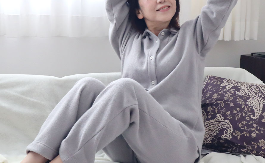 伸縮性のあるニットパイルだから着やすく、寝返りもうちやすく、動きやすい!1日中着ていてもストレスがありません。