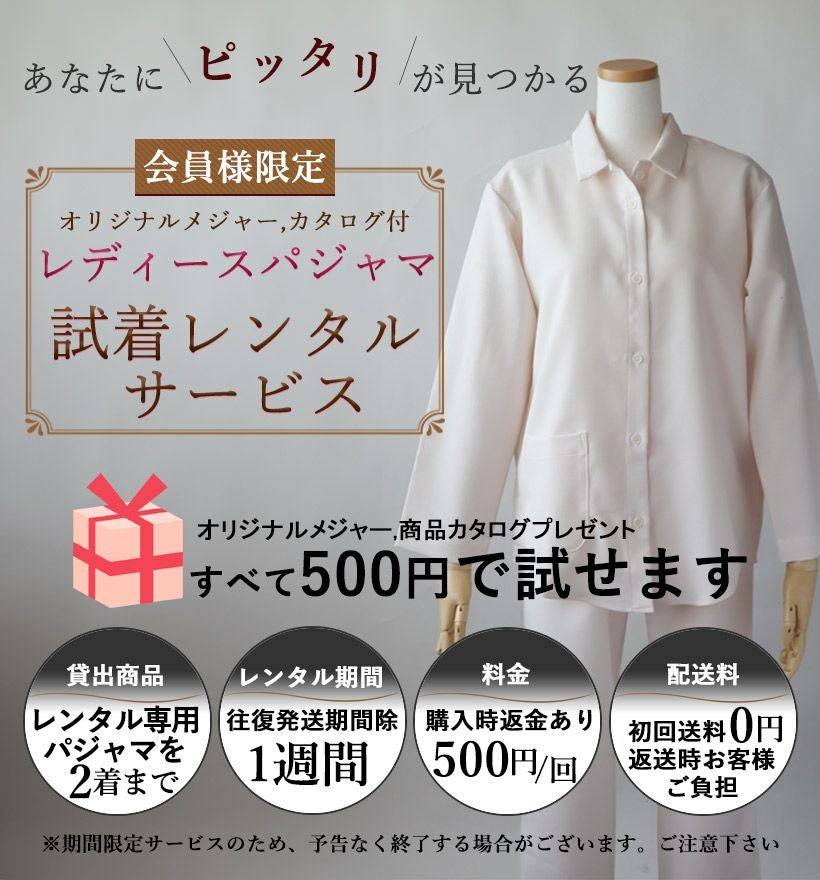 会員様限定のサービスとなります。会員登録をお願いいたします。(会員登録頂くと次回パジャマご注文時にお使い頂ける500円分のポイントを取得していただけます。※試着レンタルサービスにはお使いいただけません。)
