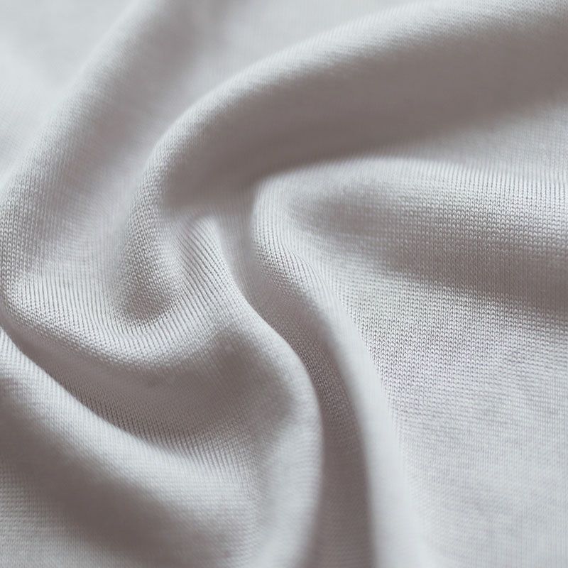 シルクに光沢があるのは、蚕が糸をつくりだす過程でできるフィブロインタンパクという層の三角の断面が作りだすプリズム効果があるからです。このシルクニットは光沢の出やすいサテン織り生地ではありませんが、シルク100%だから天竺ニット編みでも程よい光沢があります。