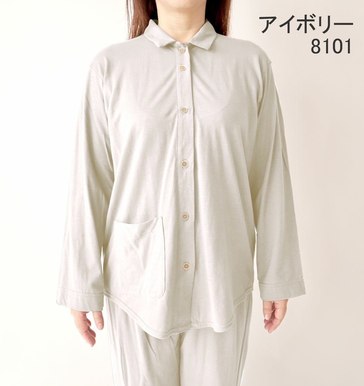 綿なのに、うれしい快適ストレッチ やわらか天竺ニットレディースパジャマ 上下セット・長袖/前開き/襟あり 【オーダーメイド】