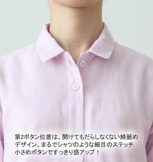 地球に優しいオーガニックコットンのダブルガーゼでバンドカラーデザインのレディースパジャマをお作りしました!柔らかな心地良い肌触りでちょっとそこまでの外出ができるおしゃれなルームウェアです!