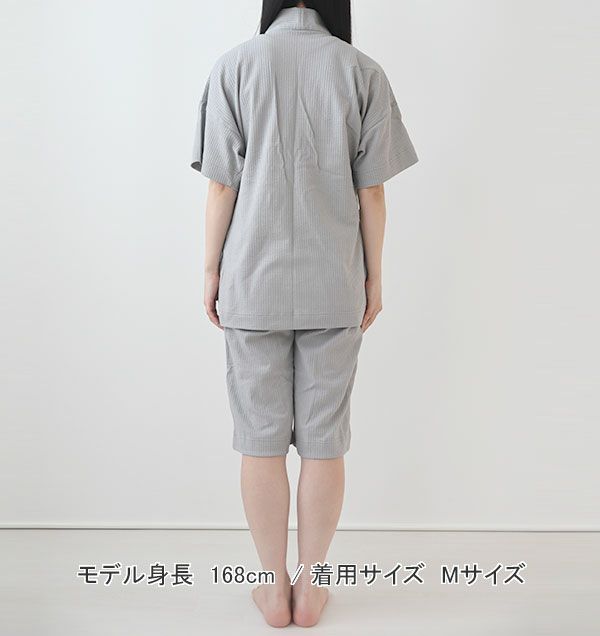 半袖、短パンでとっても涼しい甚平です。リラックス感がたっぷりあるのにちょっとした外出にきていただくのにもおすすめな甚平。