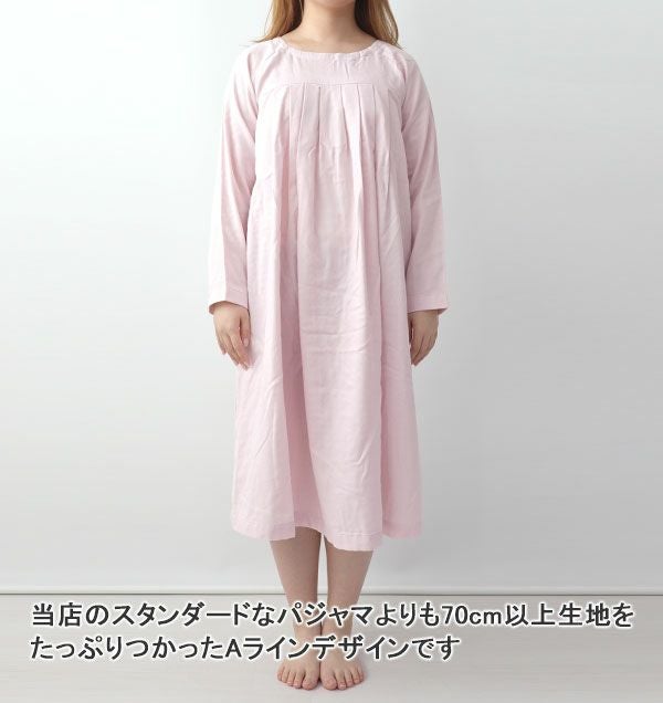 パットがないので蒸れにくく快適!胸元を隠すタックと、体のラインを目立たせないすっきりとしたAラインデザインで大人かわいいワンピース・ネグリジェになりました!当店のスタンダートなワンピースの生地幅に70センチも贅沢に生地を使っています。背中や首回りの気になりだした体型の変化にも、ゆとりがあり安心です。
