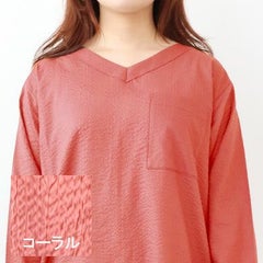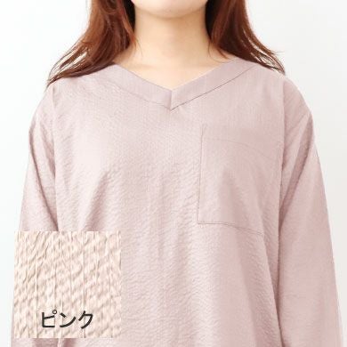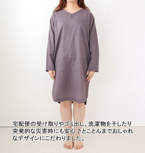 ふんわりとやわらかく、ごわごわしないエアリーリップル。Vネックデザインのかぶりワンピースでおうち時間にゆったりくつろぎを。ルームウェアにも最適!