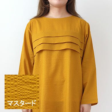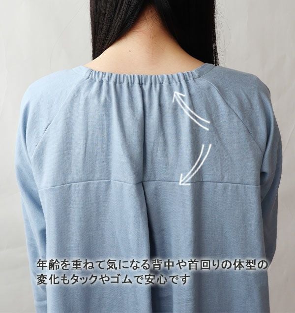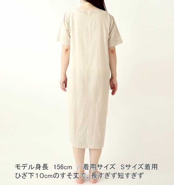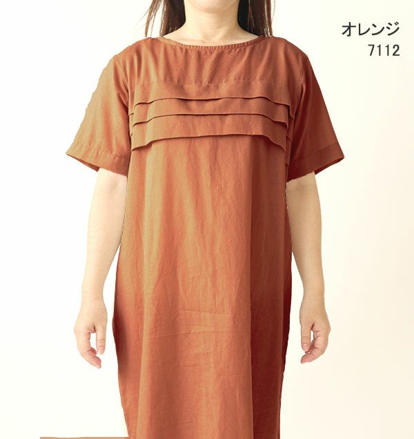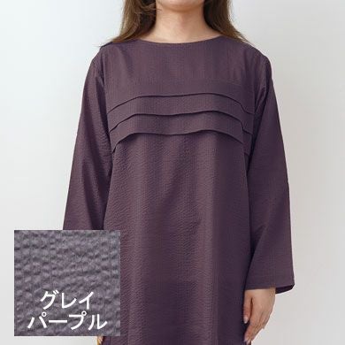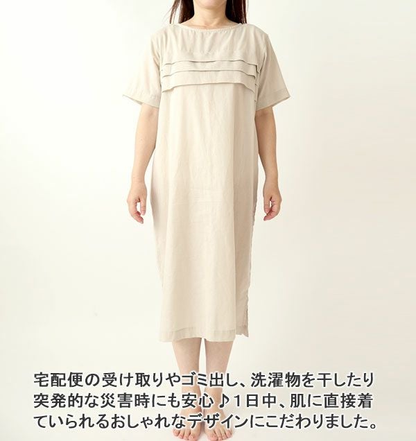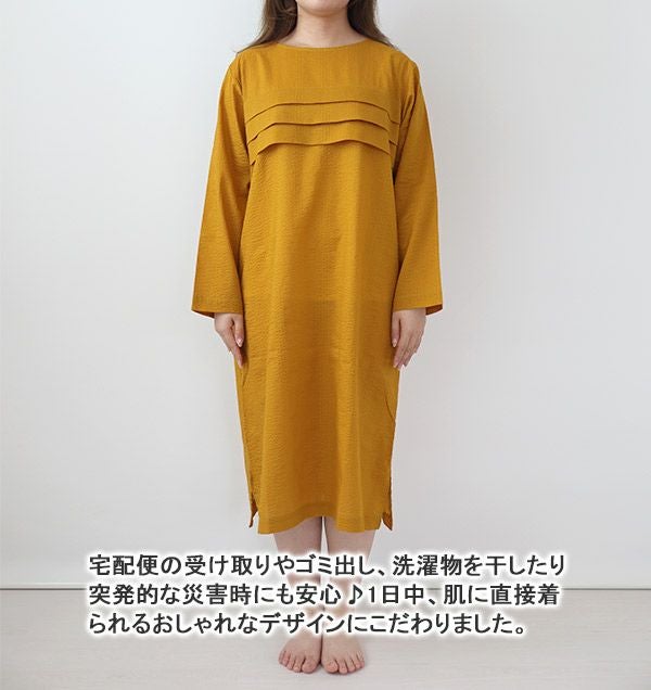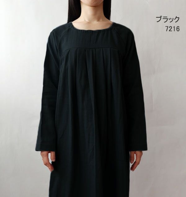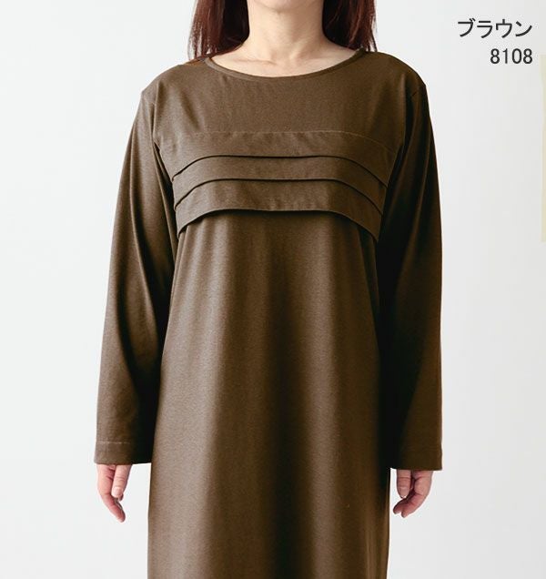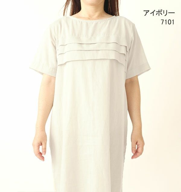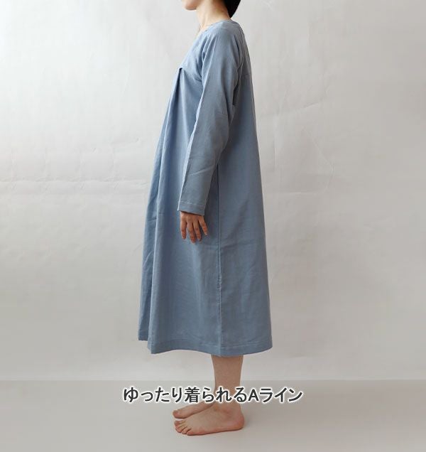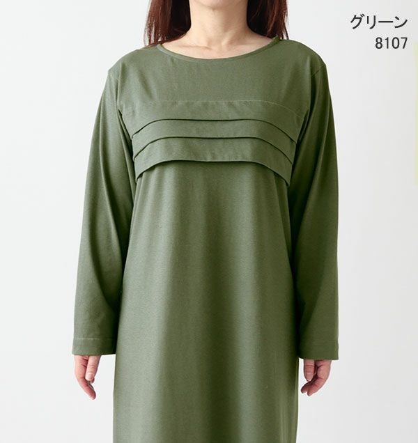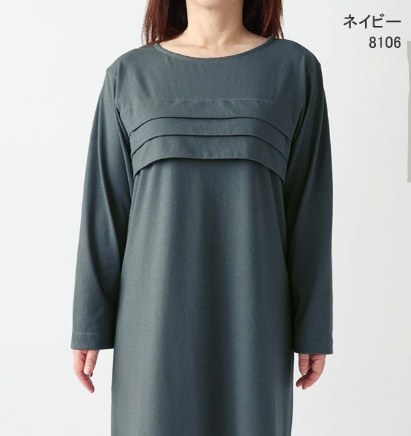 レディースのラウンドネックワンピース。XS~5Lサイズまで。胸元のタックが女性らしさを演出しながら、透け防止と機能的。生地には綿100%天竺ニットを使用。高級なTシャツのようなしっとり柔らかな肌触り、ほどよいストレッチ性で寝返りなども快適です。