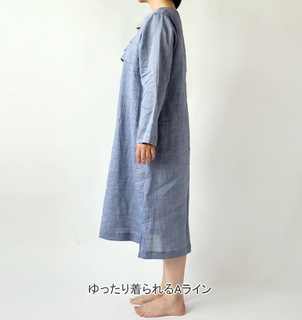目にも爽やかなシャンブレーで優しくクールダウン! 60先染めフランスリネンレディースワンピース・長袖/かぶり/ラウンドネック 【オーダーメイド】