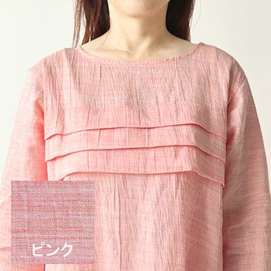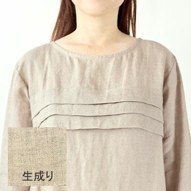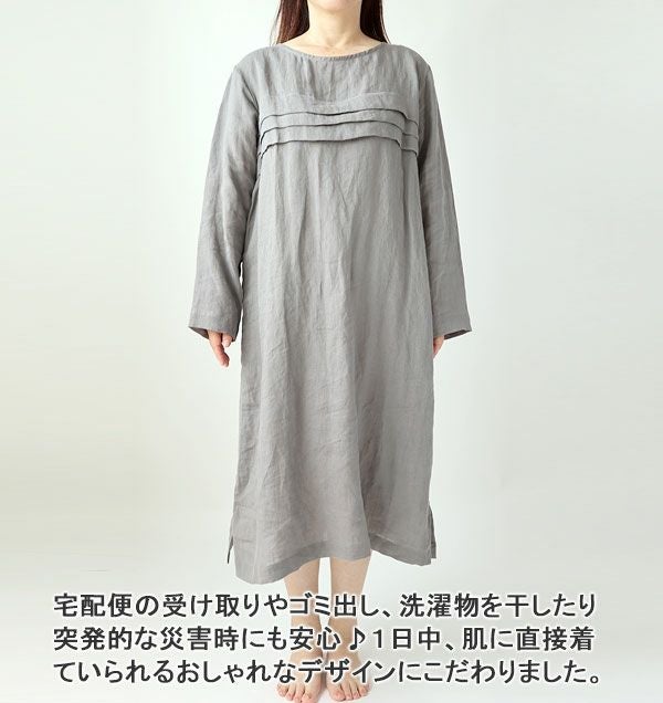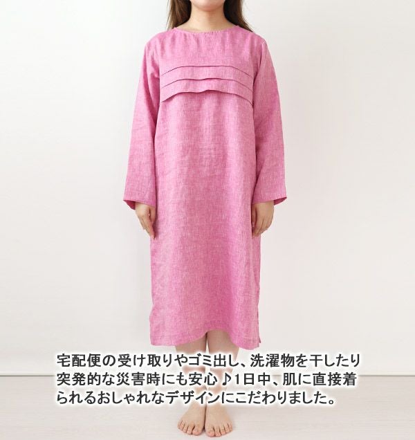 夏に最適、柔らかく軽いリネン100%パジャマのラウンドネックワンピース。レディースXS~5Lサイズまで。胸元のタックが女性らしさを演出しながら、透け防止と機能的。クールクラッシュという洗いざらし加工で、麻とは思えない柔らかさ!