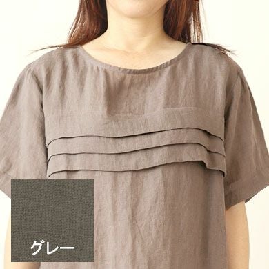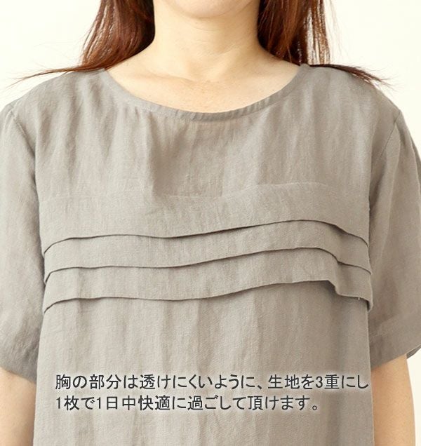 夏に最適、柔らかく軽いリネン100%パジャマの半袖ラウンドネックワンピース。レディースXS~5Lサイズまで。胸元のタックが女性らしさを演出しながら、透け防止と機能的。クールクラッシュという洗いざらし加工で、麻とは思えない柔らかさ!