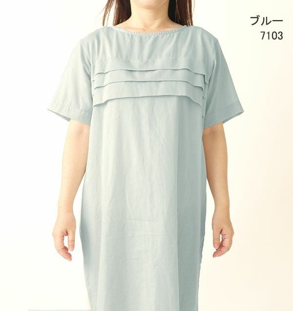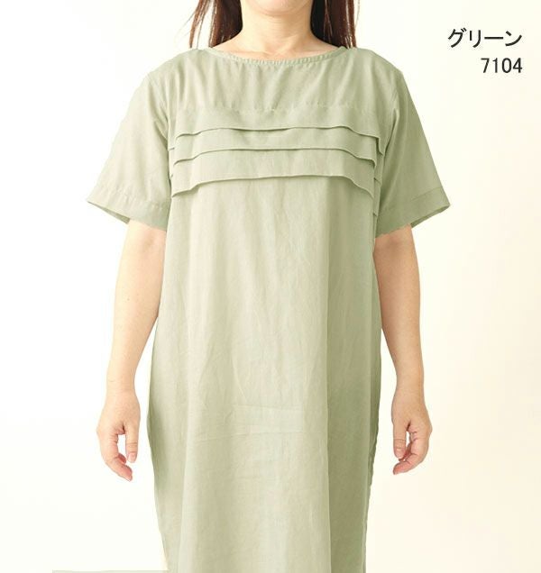 夏に最適、抜群の通気性の綿100%1重ガーゼの半袖ラウンドネックワンピース。レディースXS~5Lサイズまで。胸元のタックが女性らしさを演出しながら、透け防止と機能的。和晒製法で作られたガーゼ地で極上の柔らかさです。