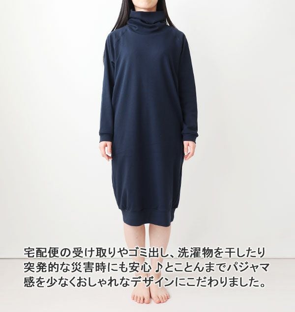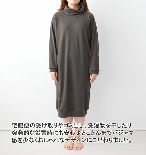 滑らかな肌触りが心地良いスムースニットのレディースワンピースパジャマからタートルネックデザインの登場です!首元が暖かく、下にレギンスなどを合わせることで冬のルームウェアとして大活躍してくれます!