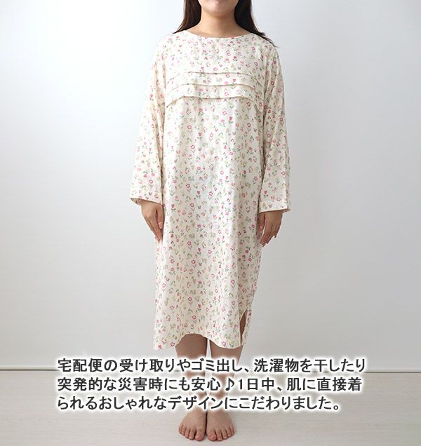 パジャマよりも解放感のあるワンピースは1枚でさらっと着用できるためとても人気の高いデザインとなっております。ワンピースでもデザインがいくつかあり、スタンダードなデザインから、女性にはうれしい胸が目立たない仕様・体型カバーができる仕様など様々ご用意しています。