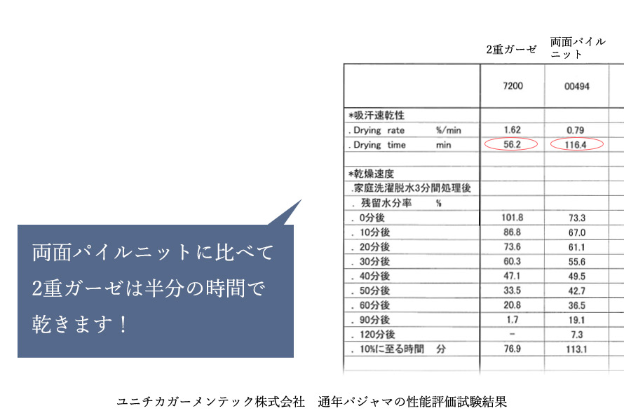 ガーゼの特徴といえば吸水性・吸湿性のよさが挙げられますが、汗をかいたりすると肌にはりつくことも。当店の2重ガーゼは、吸水性はもちろん速乾性に長けているんです!バスローブの素材としてよく使われるパイル地の半分の時間で乾くという結果も出ています。濡れた体に羽織るだけで、水分をすぐに吸収・速乾♪さらに、優れた通気性で、暖かいのに蒸れずに快適です。