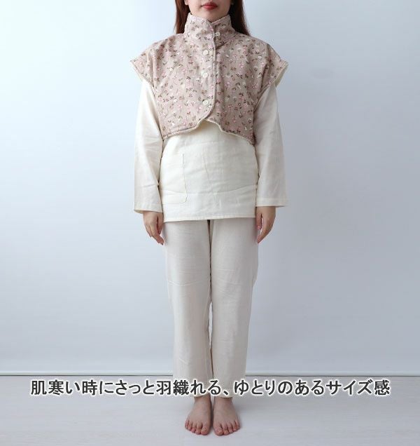 ベストといえば、ダウンのものが多いのですが、中からダウンが飛び出さない加工をされたもの(ダウンプルーフ加工)の生地はポリエステル等のシャリシャリと音がしたり、ヒンヤリ感じたり、蒸れたり羽毛の独特の匂いが気になる方も。次に多いのがフリースのベスト。初めはあったかいのですが、体温があがるにつれてムレてきて、知らず知らず寝ている間に脱いでしまうことも。また冬は静電気も気になりますね。このベストは綿100%でもしっかり防寒、肌がデリケートな方、ダウンやフリースの欠点が気になる方にぜひおすすめです!