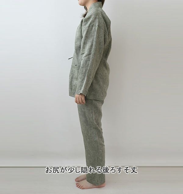 一般的な作務衣は7分丈のものが多いのですが、つくるパジャマの先染めフランスリネン作務衣は上着は手首まで、ズボンも足首まである10分丈。朝晩の冷えから守ってくれます。オプションを選んで頂くと、作業がしやすいゴムも入れられます。近江ちぢみは透けにくい素材、ジャージよりきちんと感がでますので、ルームウェアに最適です