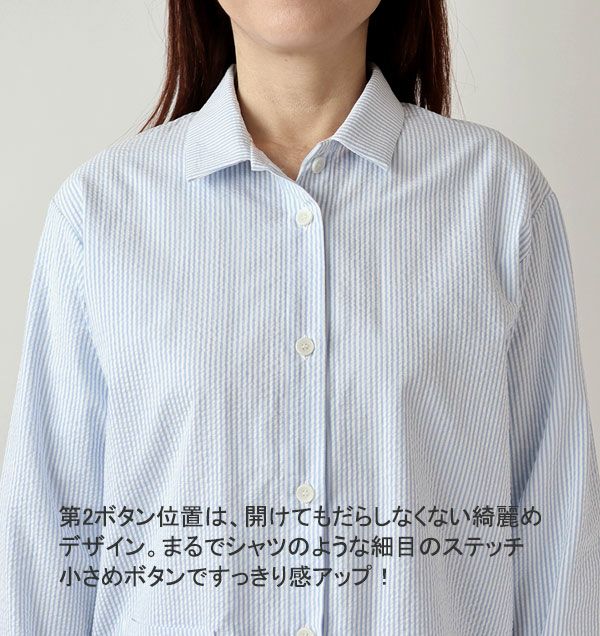 爽やかなポコポコ感!ベタつかない夏のサッカー地 先染めサッカーストライプレディースパジャマ 上下セット・長袖/前開き/襟あり 【オーダーメイド】