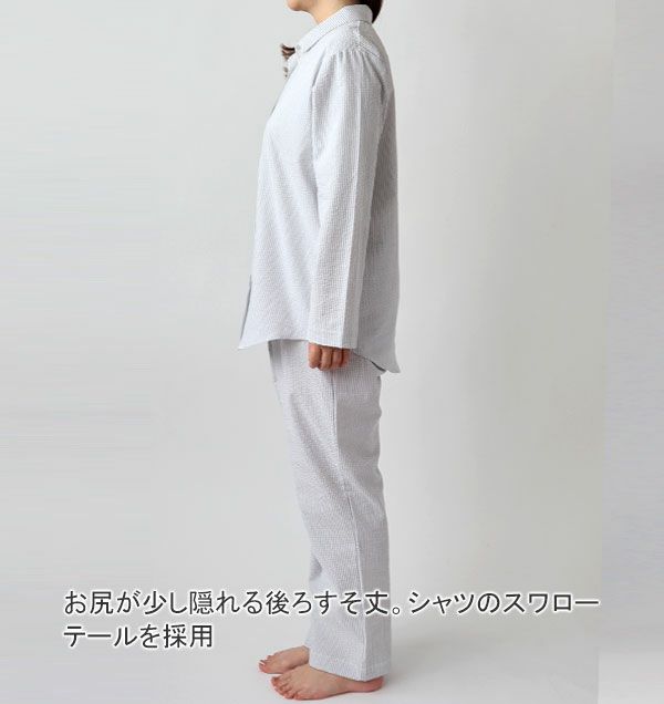 ポコポコ感でベタつかない夏のサッカーパジャマのレディースXS~12L。綿100%、先染めの産地、播州織の爽やかなストライプと柔らかな肌触りで夏のパジャマに最適です。長袖なので、クーラーの部屋でお休みの方におすすめ。さらに袖丈・ズボン丈の長さも調整可能!