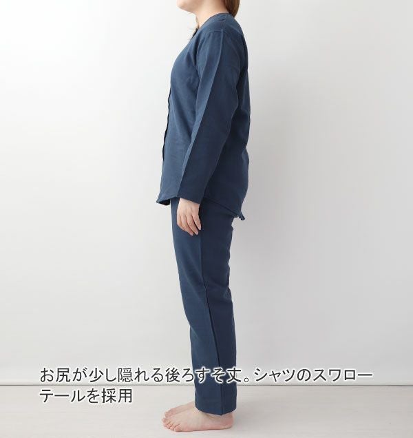 襟が苦手な方に着ていただきたい、前開きの襟なしパジャマです。首元すっきり着脱もしやすくいつでも快適に。まるでシャツのようなデザインで、パジャマはもちろん、部屋着・ルームウェアにもぴったりです。