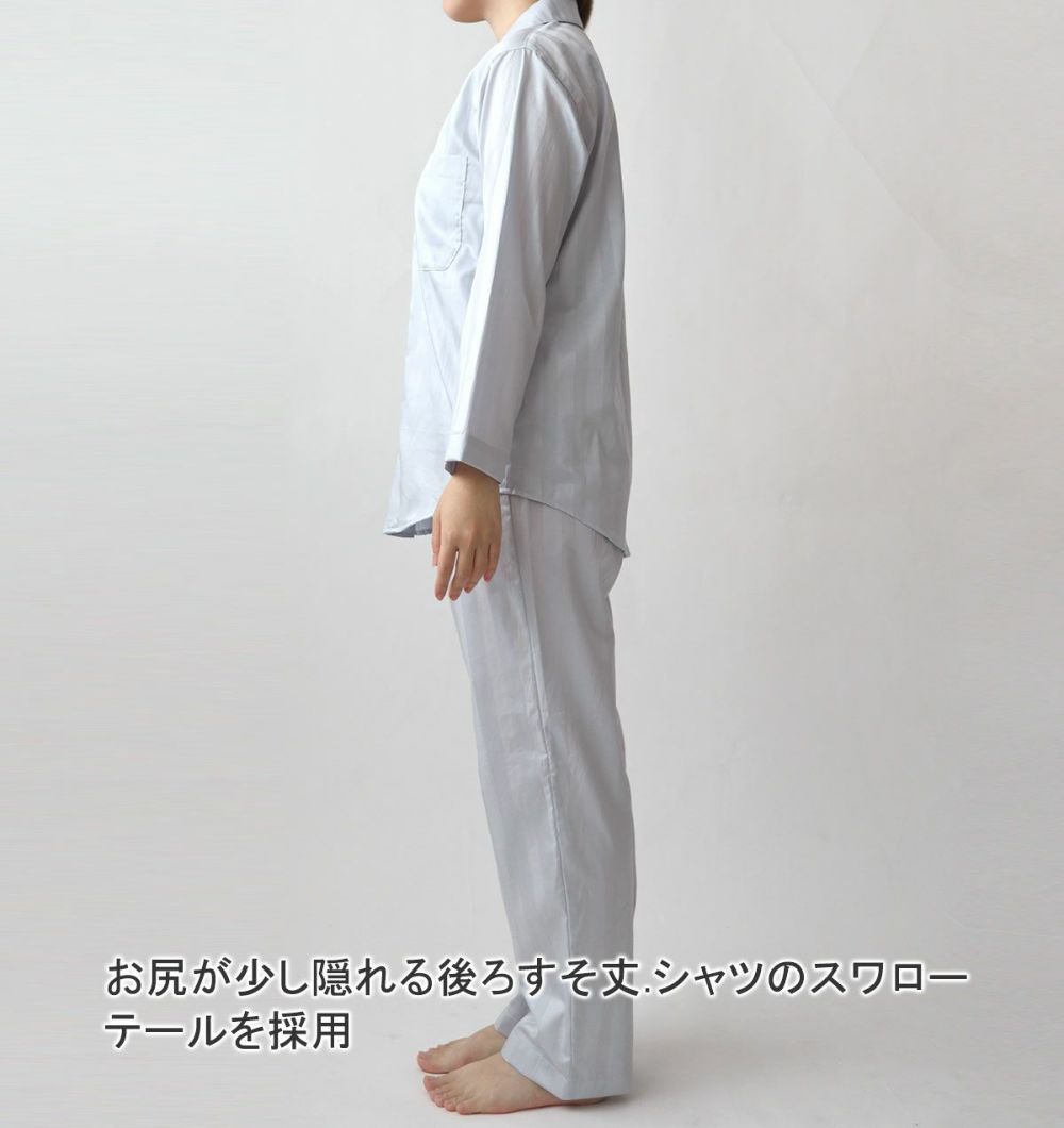 いろんなホテルでも採用されているサテンストライプ。ゆったりした首元の開襟デザインで、ホテルに滞在しているようなラグジュアリーなひとときを。