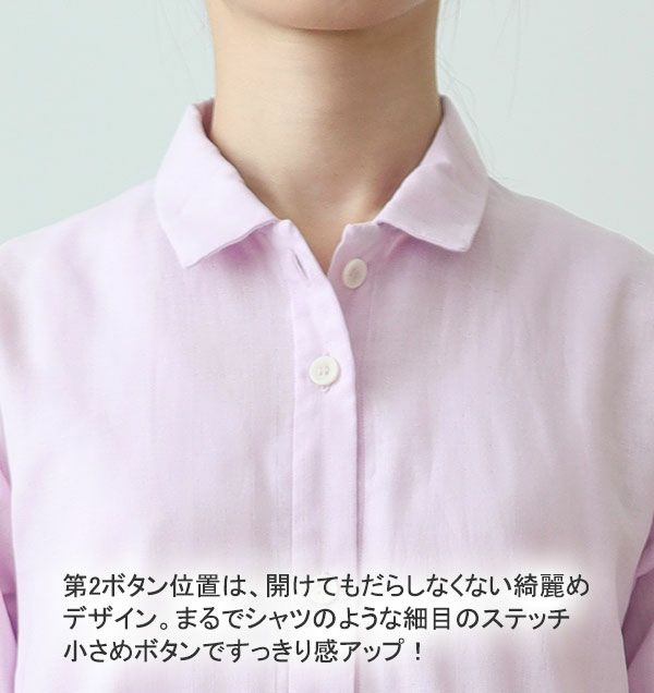 地球にもお肌にも優しいオーガニックコットンダブルガーゼのレディースパジャマ上着単品です!ワンマイルウェアとしても活躍するおしゃれなバンドカラーで、肌触りも良く身も心もリラックスさせてくれます!
