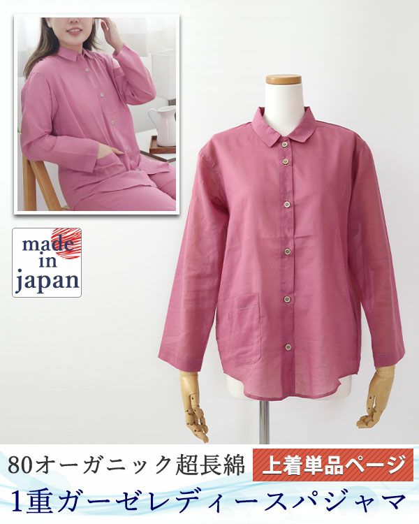 新感覚ガーゼ!柔らかいのにサラサラの肌触り 80オーガニック超長綿1重ガーゼレディースパジャマ上着単品・長袖/前開き/襟あり 【オーダーメイド】