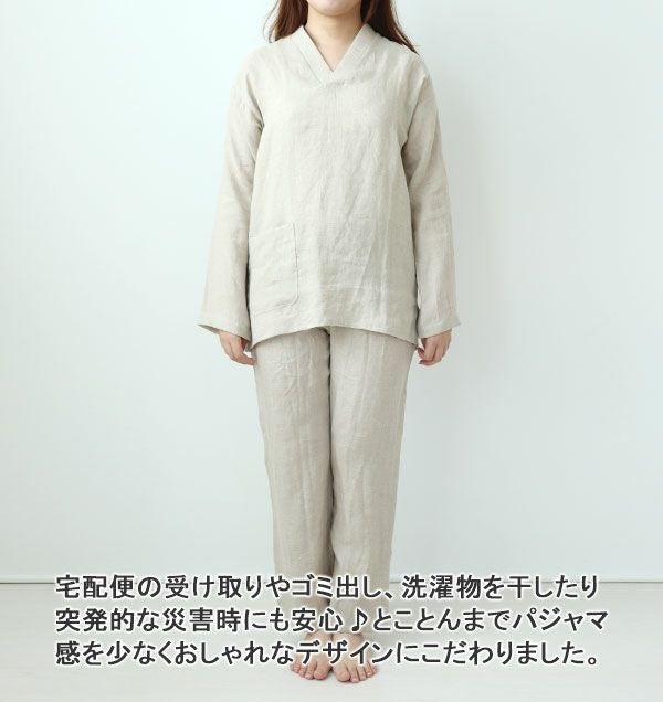 べたつかずに柔らかな風合いが夏に最適なフランスリネンのレディース作務衣下着のズボンセットです!軽くて涼しく、蒸れにくく快適に夏をお過ごしいただけるルームウェアです。