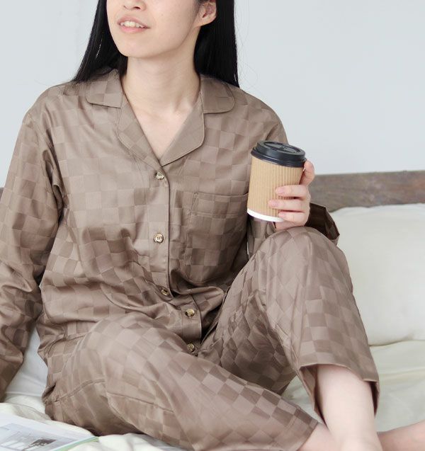 昼夜サテンならではの美しい光沢のコントラスト ブロックチェックサテンレディースパジャマ上下セット・長袖/前開き/開襟 【オーダーメイド】