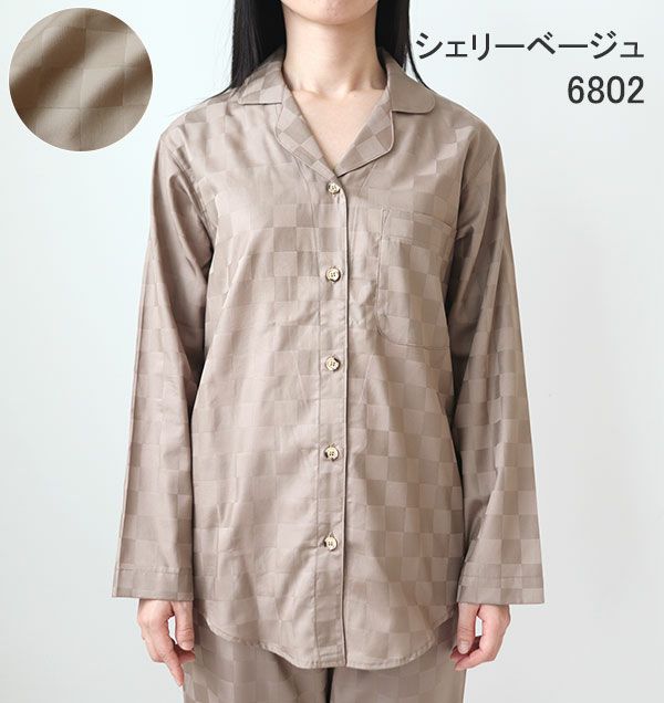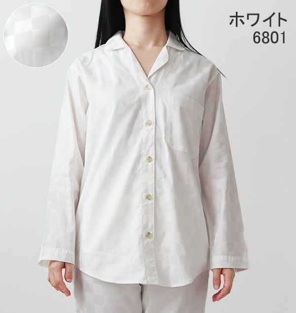 サテンパジャマの定番デザイン、長袖の開襟タイプ。婦人用、XS~5Lまで。スーピマ超長綿ならではの美しい光沢ととろけるような滑らかな肌触り、まさに大人のサテンパジャマです。袖丈、股下を調整できるセミオーダーメイド対応。