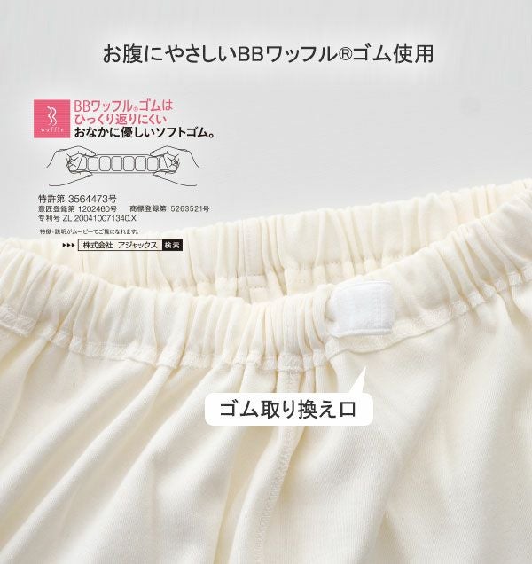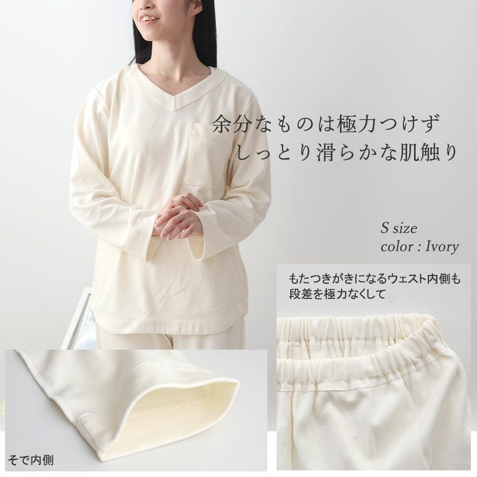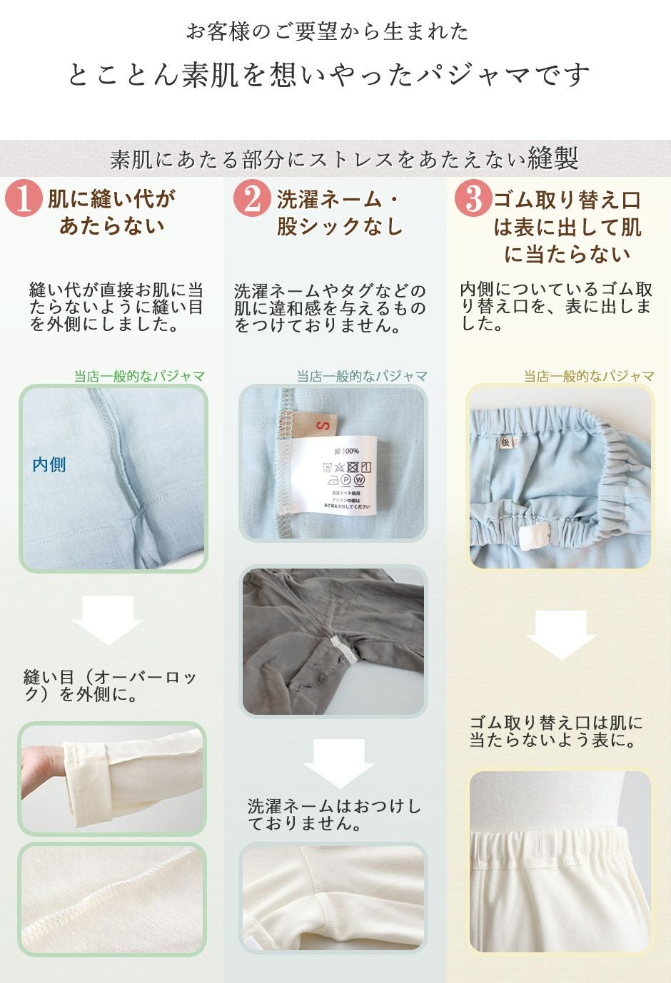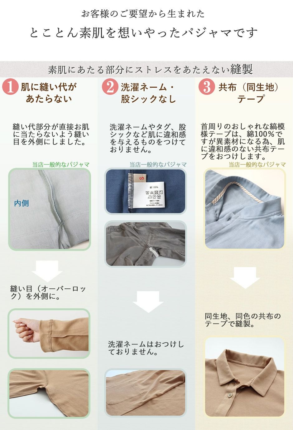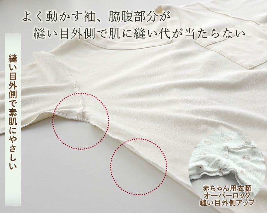 肌に直接縫い代があたらないよう折り伏せ縫いや折り返し縫いを行ったり、生地によっては、縫い目を外側にするなどの特殊縫製を行った優しい縫製です。