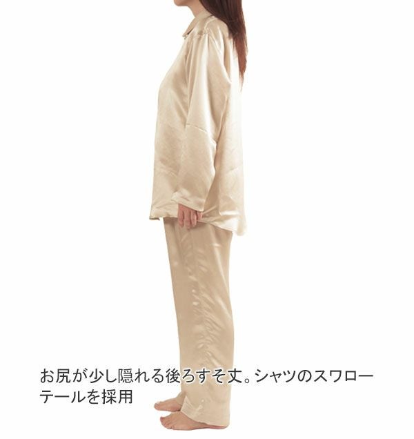 シルク・絹100%のサテンパジャマ上着単品。レディースXS~5Lサイズまでご用意。極上の光沢と滑らかさ、19匁ならではの軽さ。さらにサンドウォッシュ加工でより柔らかな風合いに。吸湿性、吸水性、発散性に優れ、一年中快適です。毒素排出、美肌効果も。