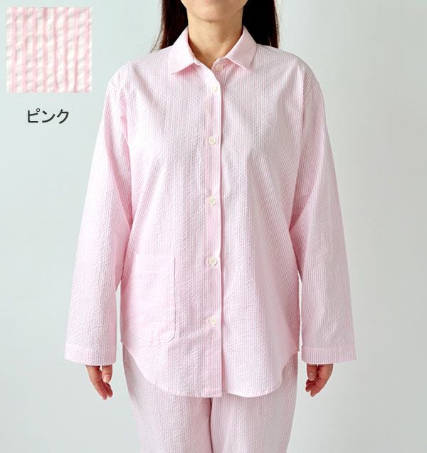 爽やかなポコポコ感!ベタつかない夏のサッカー地 先染めサッカーストライプレディースパジャマ上着単品・長袖/前開き/襟あり 【オーダーメイド】