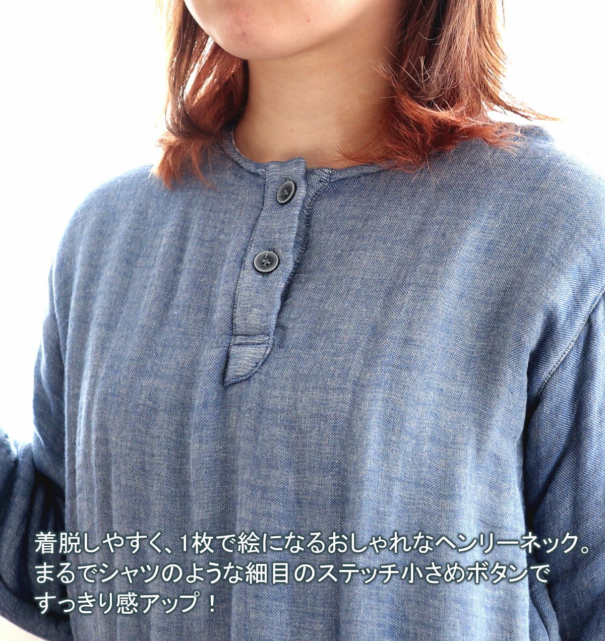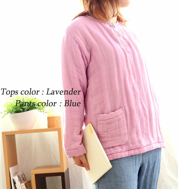 おしゃれなヘンリーネックの冬のあったかガーゼパジャマ 3重ガーゼレディースパジャマ上着単品・長袖/かぶり/襟なし 【オーダーメイド】