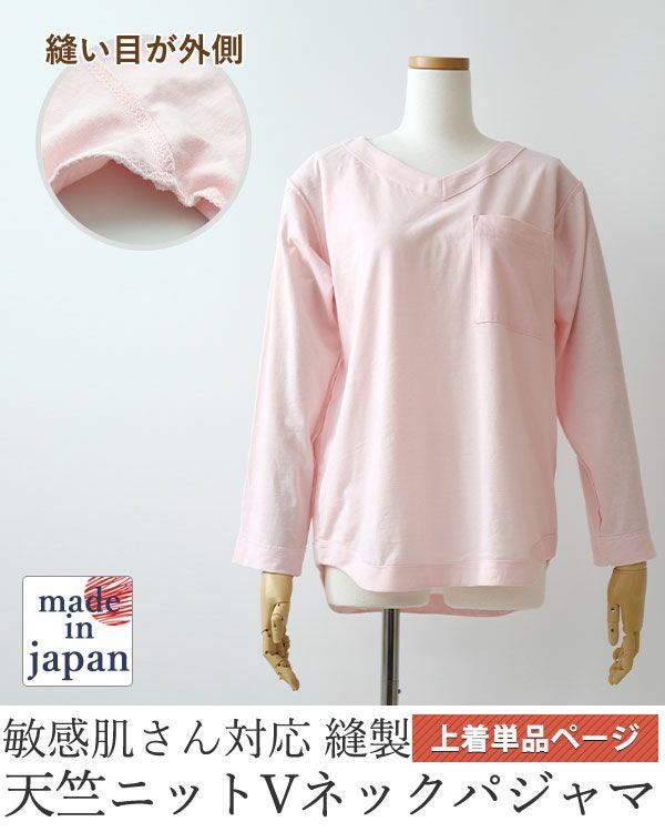 縫い目が外側だからチクチクしない! やわらか天竺ニットレディース敏感肌パジャマ上着単品・長袖/かぶり/Vネック 【オーダーメイド】