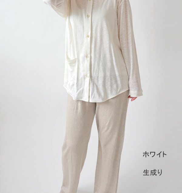 リネン麻のニットパジャマズボン単品です。レディースXS~5L。ベルギーリネン100%の美しい光沢と麻ならではの清涼感、天竺ニット編みの薄手で柔らかく、ほどよい伸縮性で夏に快適なリラックスパジャマです。長ズボン。