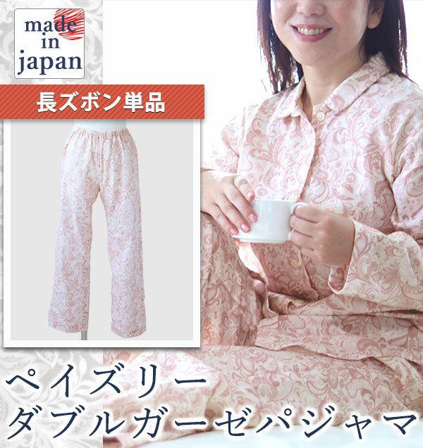 大人気のふわふわ柔らかダブルガーゼパジャマからペイズリー柄が新登場!レディースXS~5L。ズボン単品。高級感あふれる大人のガーゼパジャマです。ズボン丈の長さを調整できる簡単セミオーダーサービスが可能です。