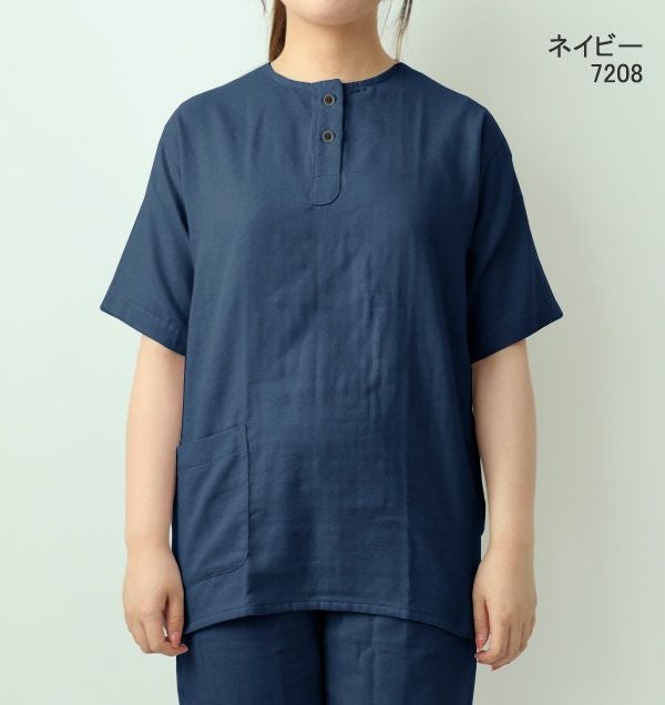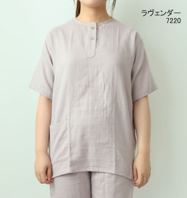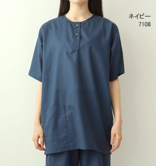 肌にはりつかず柔らかな触感が心地良い綿リップルでお作りしたレディース半袖ヘンリーネックパジャマです!80番手で非常に軽く、短パンの上下セットで涼しく夏を快適にお過ごしいただける一枚です!