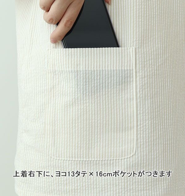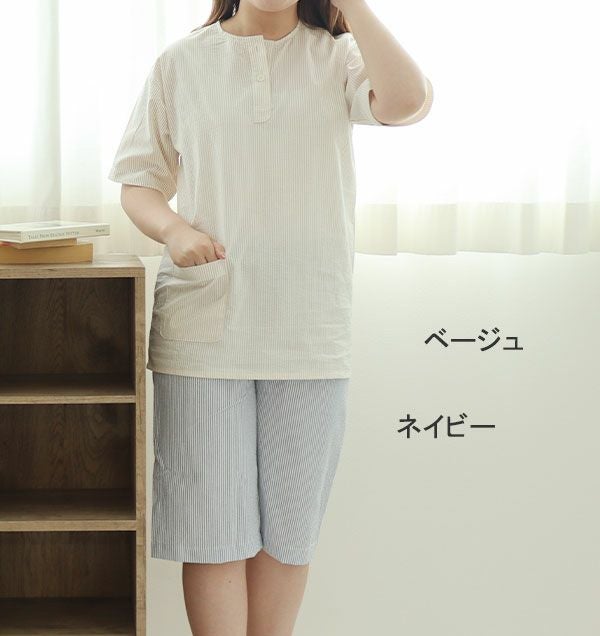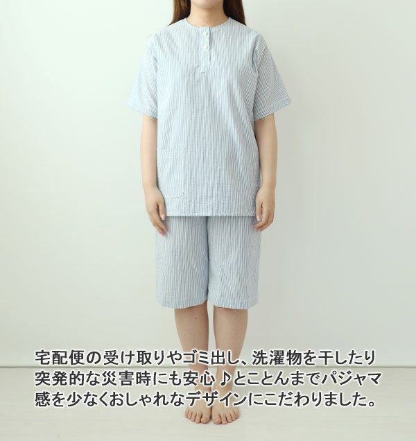 ポコポコ感でベタつかない!涼しい爽やかな夏 先染めサッカーストライプレディースパジャマ上下セット・半袖/かぶり/短パン/ヘンリーネック 【オーダーメイド】