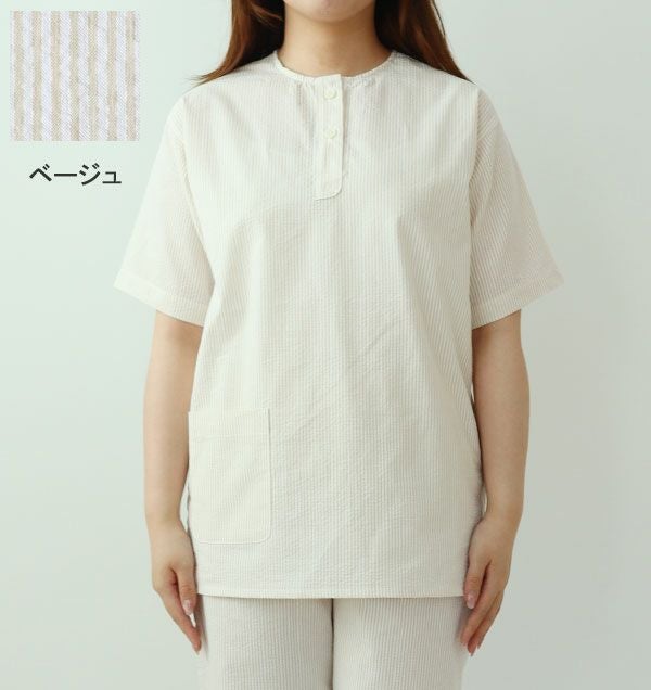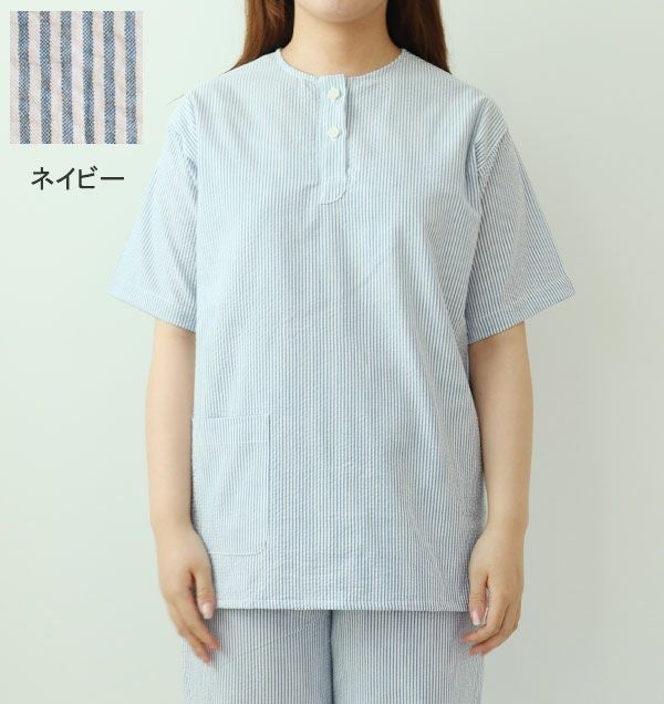 べたつかない爽やかな肌触りが心地良いサッカー地のレディース半袖パジャマです!雰囲気のある先染ストライプでデザインもおしゃれなヘンリーネックなので、夏のルームウェアとしても最適な一枚です。