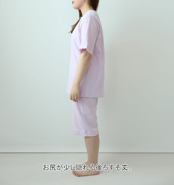 ふわっと軽くてべたつかない夏のリップルパジャマのレディースXS~12L。綿100%、80番手の極細糸を使用し、薄手で涼しく、何より軽く、柔らかいのが特徴です。半袖短パンなので、とにかく暑がりの方におすすめ。