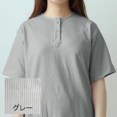 柔らかな肌触りが気持ち良い天竺ニットのサッカー素材でべたつかないレディースパジャマの登場です!半袖ヘンリーネックデザインでルームウェアとして夏をおしゃれに快適にお過ごしいただける一枚です!
