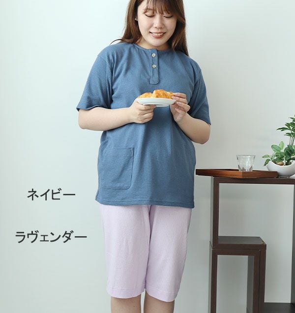 べたつかない、夏のやわらかリラックス ニットサッカーレディースパジャマ上下セット・半袖/かぶり/短パン/ヘンリーネック 【オーダーメイド】