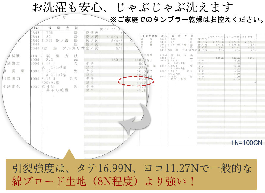 80番手使用の長綿は実はとても丈夫です。取り扱いの難しいデリケートなシルク等とは正反対でご家庭の洗濯機でジャブジャブ洗えます。一般的な綿ブロード生地より強く丈夫だという結果がでています。