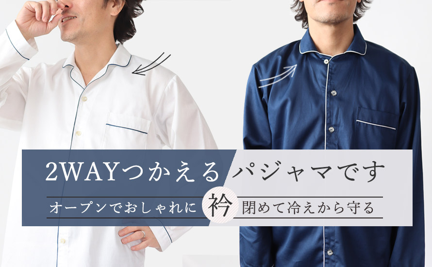 開襟のパイピングのパジャマは大変高級感がありますが、いざお休みになられる時は首があいていて寒いというお声をいただいておりました。お風呂あがりはボタンをはずして、就寝時は第一ボタンをしめて首もとを冷えから守れる、2通り楽しめるおしゃれなデザインです。