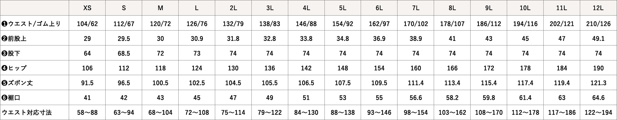 ズボンサイズ表のウェスト対応寸法やヒップのサイズから基本のサイズを選び、ウェストゴム上りをご覧下さい。