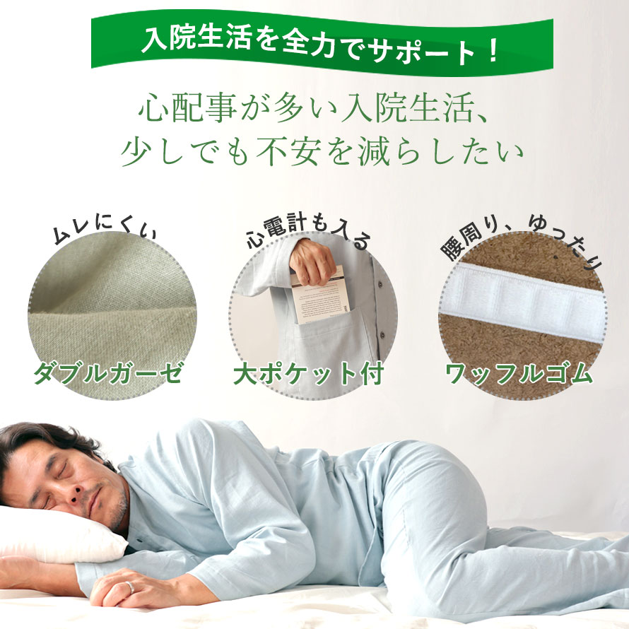 分厚いパジャマは体温調節が難しいので、寒ければ上に羽織るのが正解です。入院着をレンタルはできますが、乾燥機をかけられたり素材の特性上でゴワゴワするものも。和晒ダブルガーゼ生地は特有の柔らかさとふんわり感で肌へのストレスがありません。ダブルガーゼは春秋用のオールシーズン使える素材ですので、室温管理されている院内では最適です。