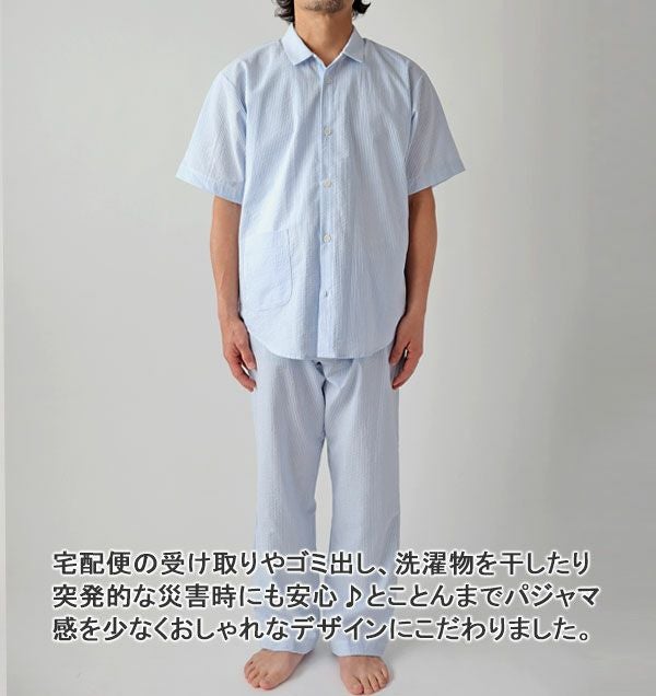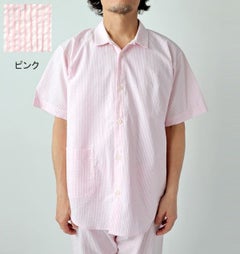 まるでシャツのようなストライプ柄。ズボンだけかえればゴミ出しはもちろん外出にも着ていけそうです!涼しい夏の半袖ルームウェアとしても